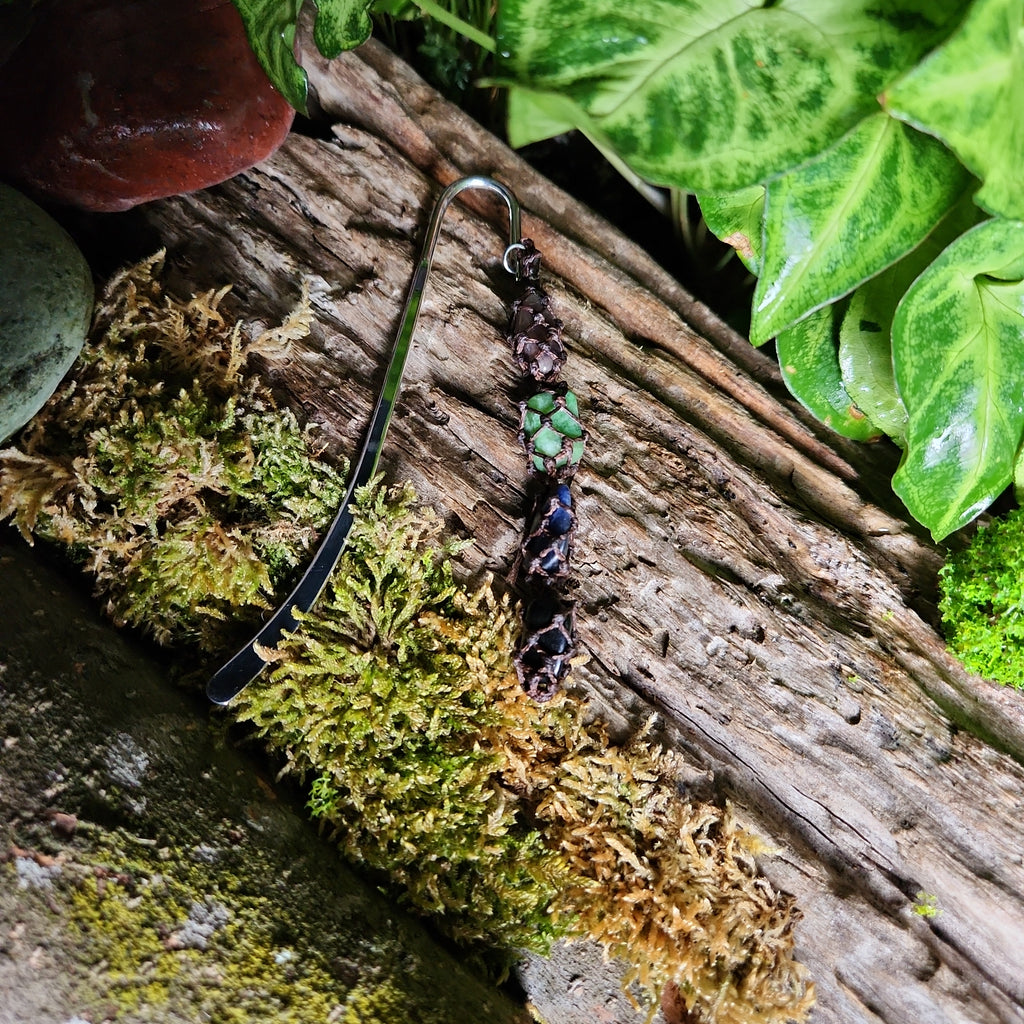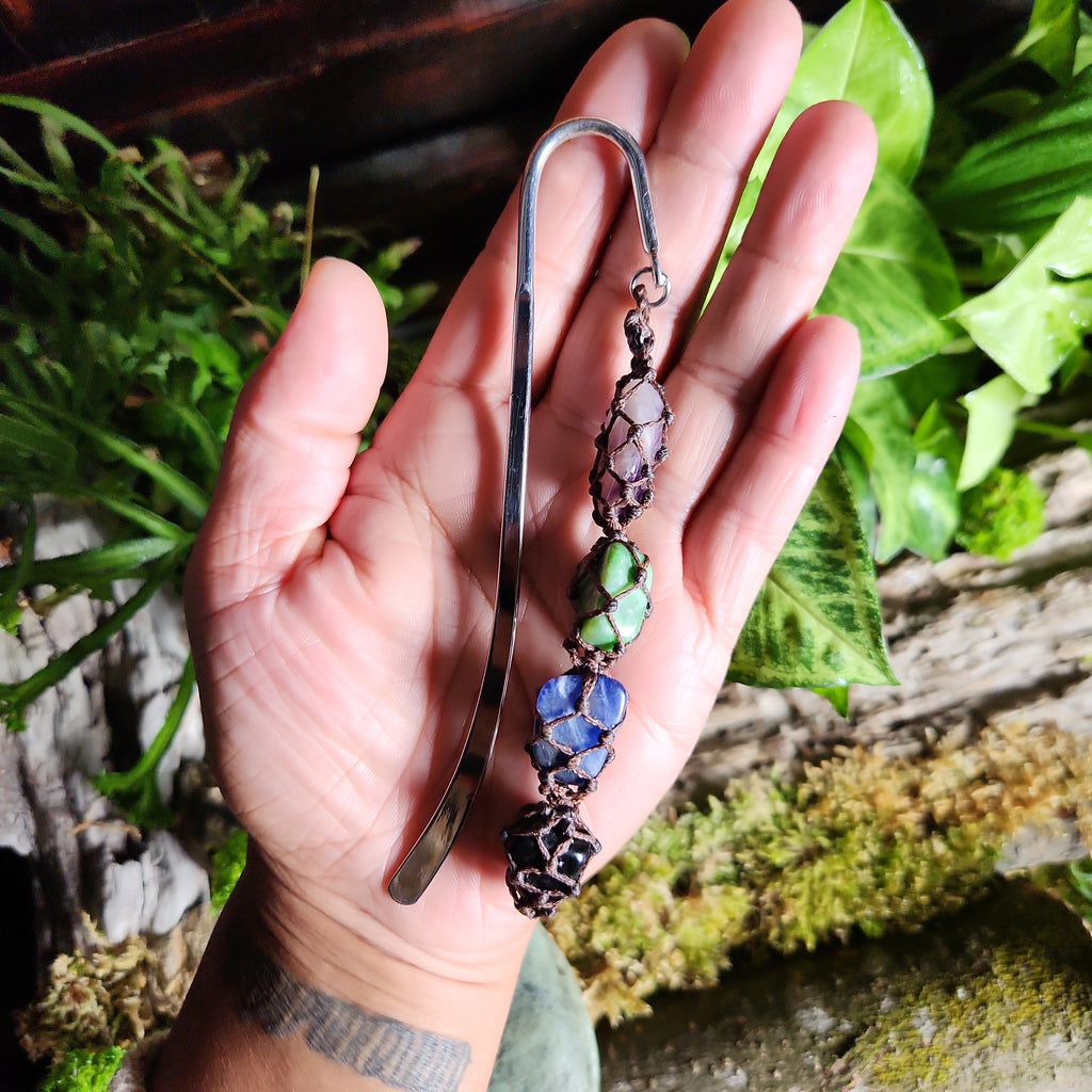 This one of a kind brown kupenga book mark made with tumbled amethyst, pounamu, sodalite and obsidian pieces.